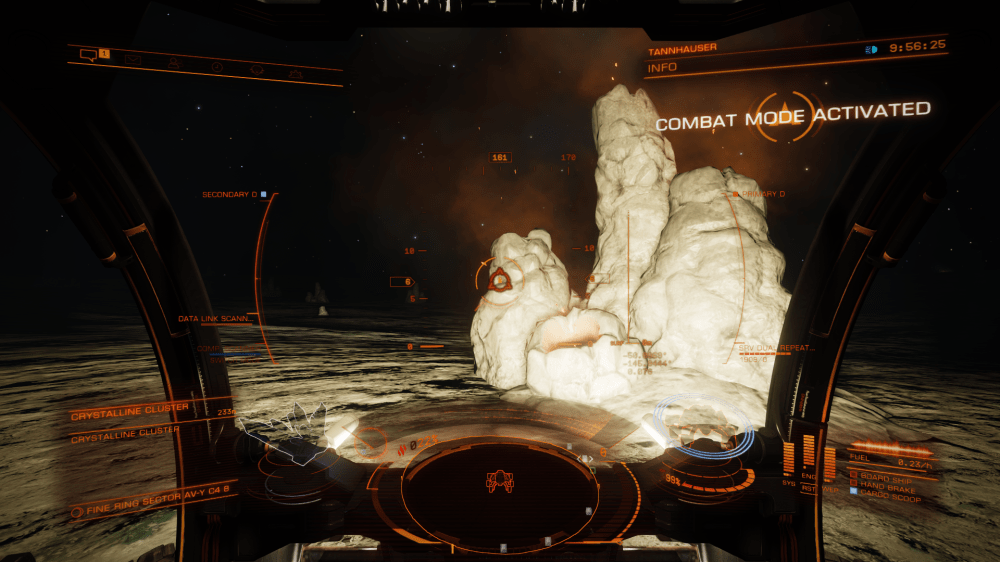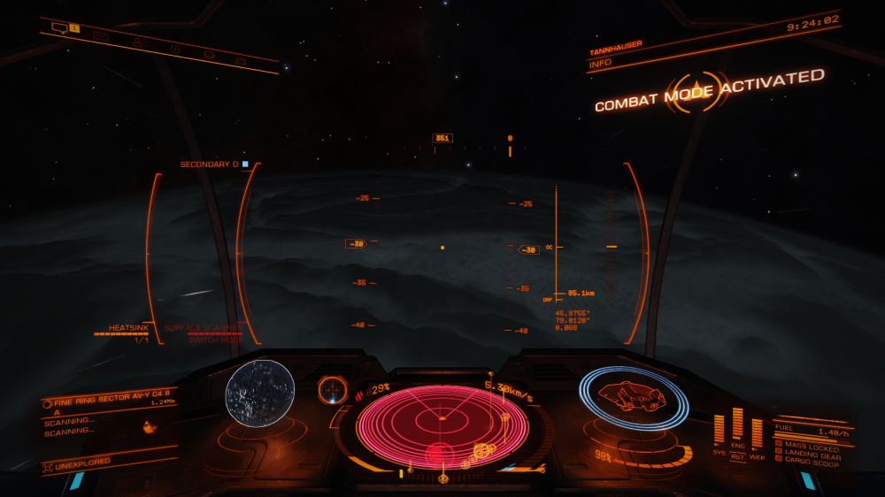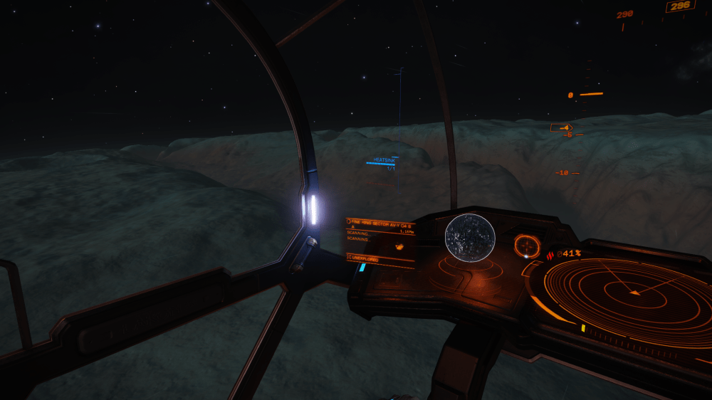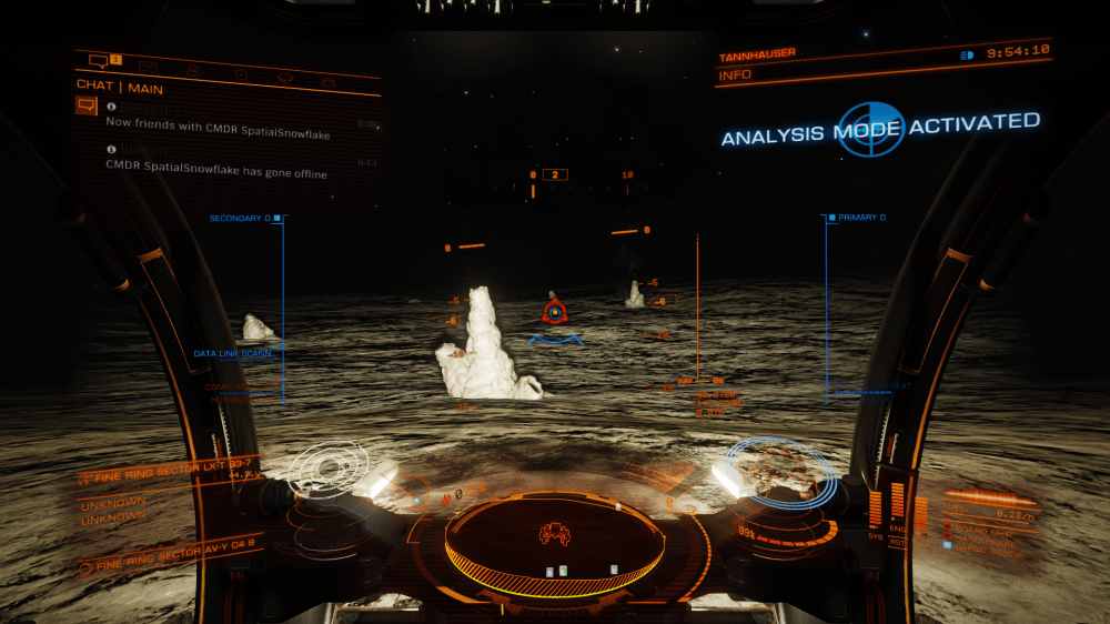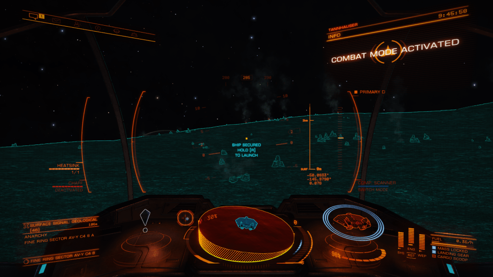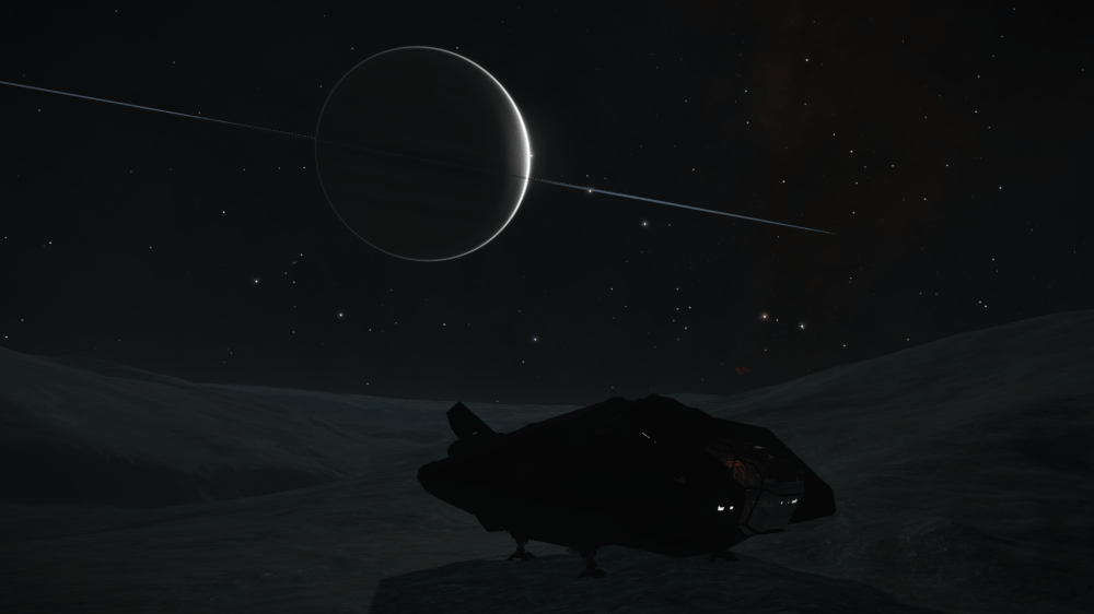 Then jumped into a system with some unremarkable Icy worlds, but the FSS scanner got a hit on a possible Geological location which warranted a closer look… Made planetfall with no issues and located some strange rock clusters with steam shooting out of them, very dark and hard to see much so retreated back to Tannhauser to wait for the dawn…