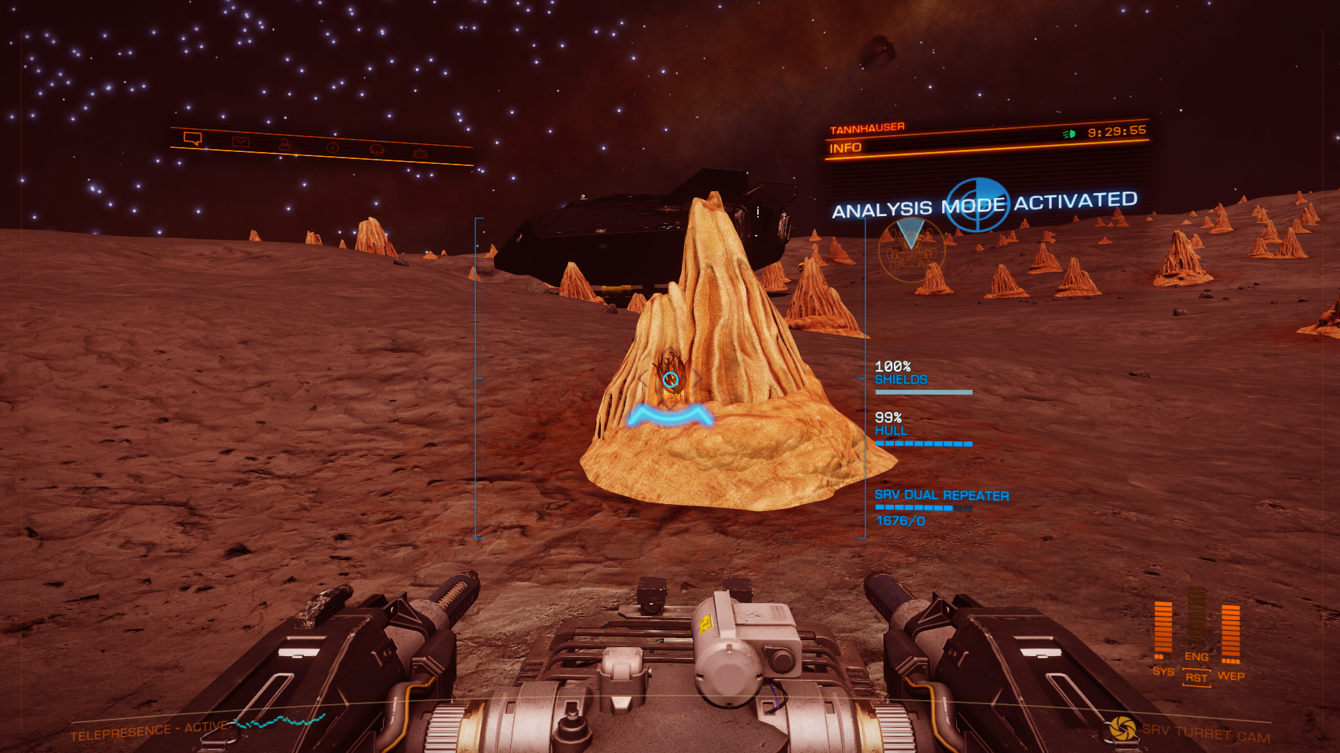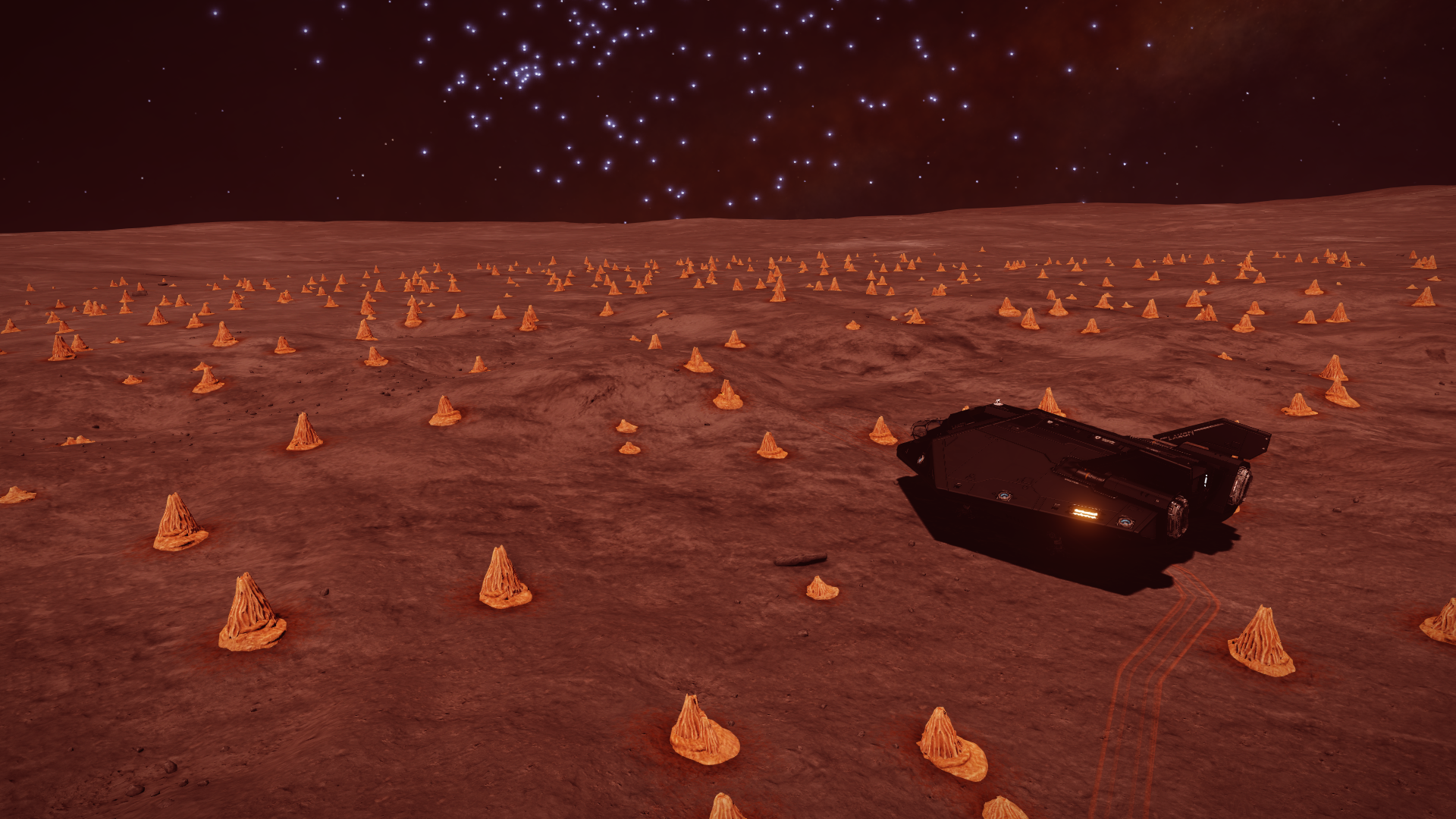 DW Exploration Command has requested explorers set out in search of ‘pristine mining locations’ Plotted a course to a random destination and set out… after several fruitless systems happened upon Omega Sector IH-V c-18 An FSS scan revealed 25 bodies with several high metal content worlds… and 3 sites with possible biologicals !! But the planets in question are 300K LS from the jump in point. Time to settle back with some good tunes and eat up the distance… Arrival at planet C4 fire off 3 mapping drones, and sure enough Biological Activity Confirmed. Head on in and land to find a large field of ‘Bark Mounds’ my first time finding these.
