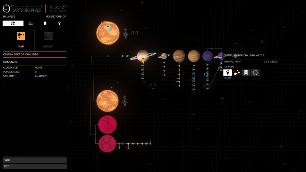 Another trip out from Omega Mining Base in search of suitable mining locations but no joy, mapped a few systems and got 6 more first to discover, found a few High Metal Worlds but nothing of note.