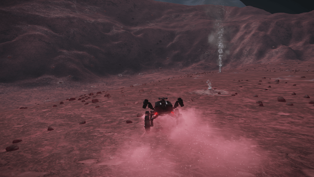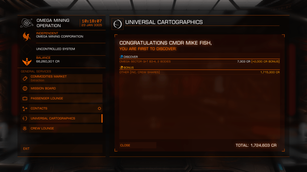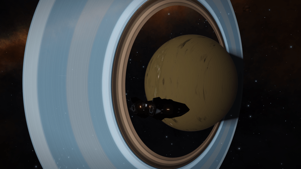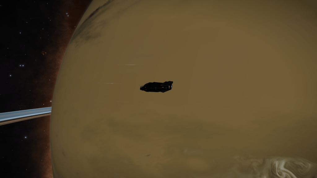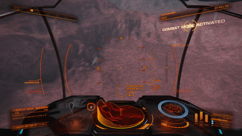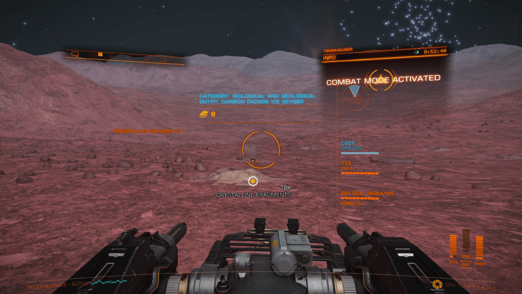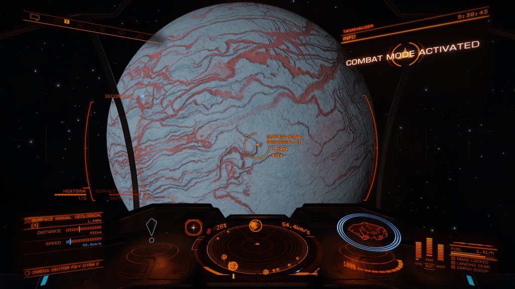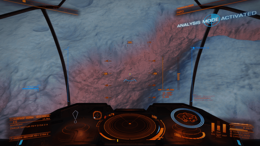 Headed out from Omega Base Station again today, looking for mining sites or anything of interest. Failed to find much of anything until I chanced upon Omega Sector FG-Y D154 which had a series of High Metal Content moons around a Gas Giant which registered as containing ammonia-based life forms (Algae probably). FSS showed some geological points of interest too so I got in close and fired off some mapping limpets. The Moon was crisscrossed with what looked to be fairly deep ravines so headed down for a closer look. Did some exploratory runs before locating a field of geysers venting something straight up, decided to land and check them out. Headed out in the SRV and all went well until I inadvertently went over a vent just as it vented, SRV was blasted many hundreds of meters straight up a very unnerving experience floating around waiting for the inevitable impact. SRV bounced some 4 or 5 times and suffered moderate damage, was flung so far away I lost contact with Tannhauser on the scanner, had to send a remote signal to get Verity to relocate the ship close by, then had to maneuver up a steep ravine to reach the safety of the ship, altogether not an experience I want to repeat any time soon. Pay more attention to vents in unstable geological locations in the future! Made it back to omega Station and cashed in Exploration Data, only the 1 first discovered this time.