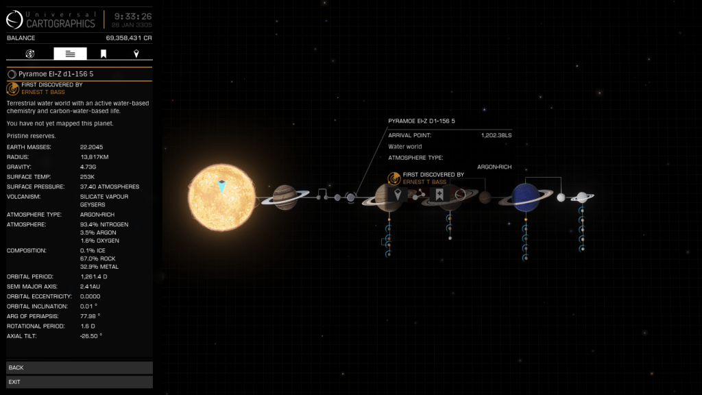 Tannhauser is fully stocked but flight ops are swamped so we wait for release authorisation… A lot of ships heading out and the station is seriously struggling under the load. Eventually, I get the all clear and jump out of the system, goodbye to Omega Mining Operations hello to the deep black. First few systems are routine icy/rocky combos, nothing of any interest until I arrive at Pyramoe EI-Z D1-156 some 30 odd bodies and 2 water worlds to check out, not first to discover but still worth a look on the way past