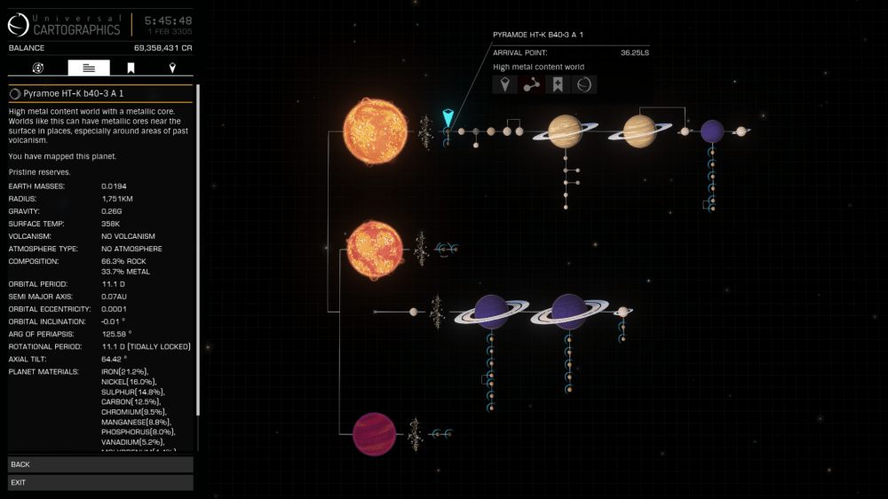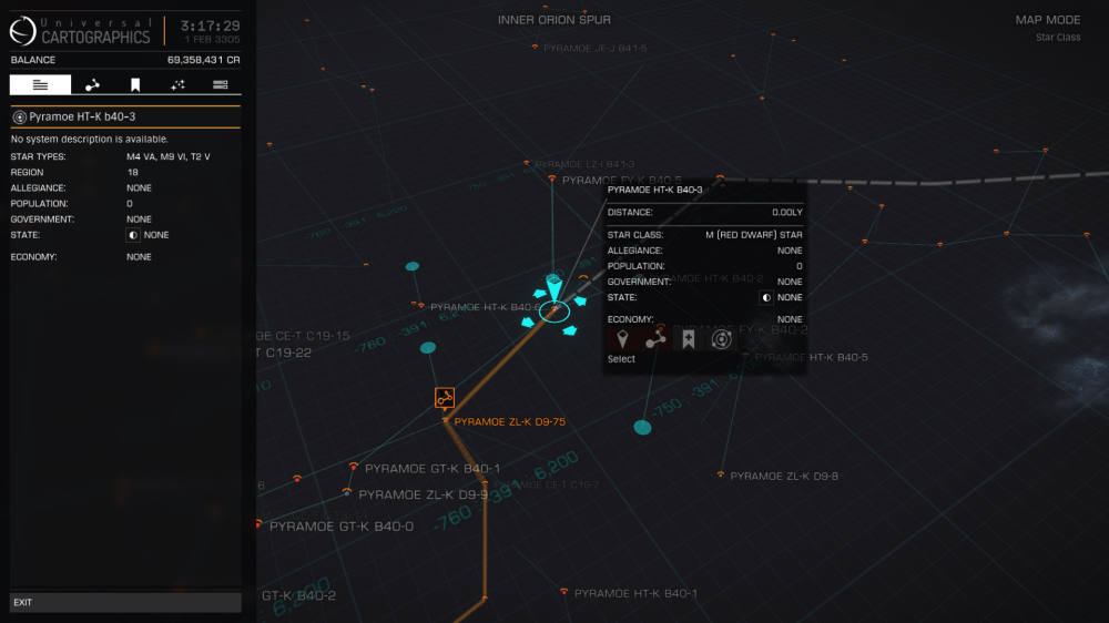 Pyramoe HT-K b40-3 contained 80 Stellar Bodies including 4 stars and 2 Stellar Phenomenon, which contained Metalic Spheres and two new types of Crystals, there is also Planet A3 a terraformable water world. Definitely the best find of the Journey to date.