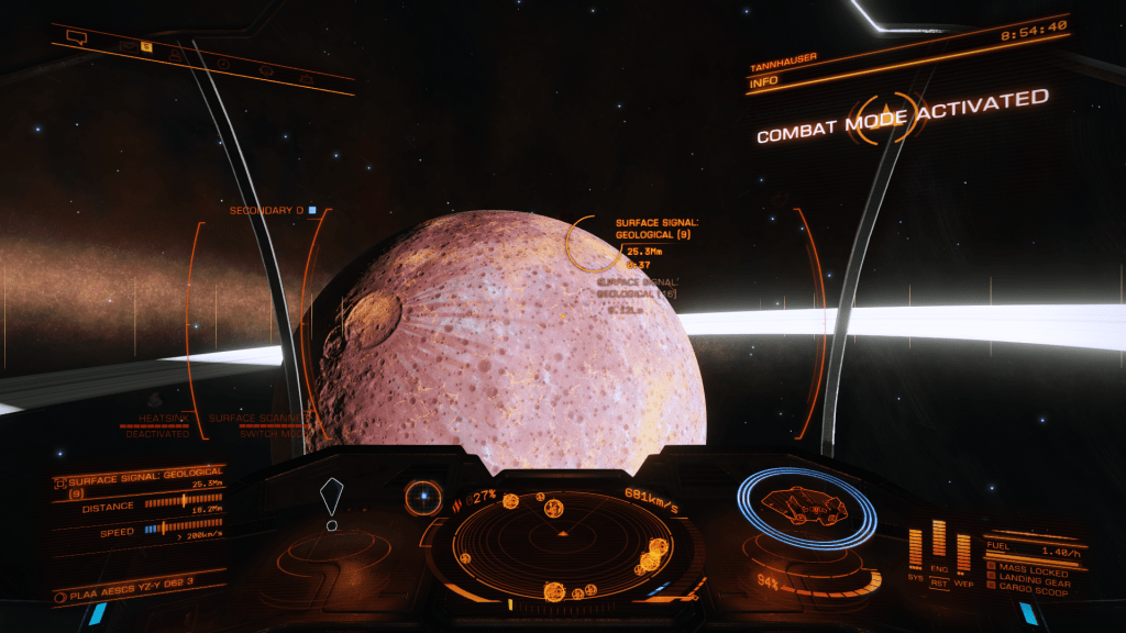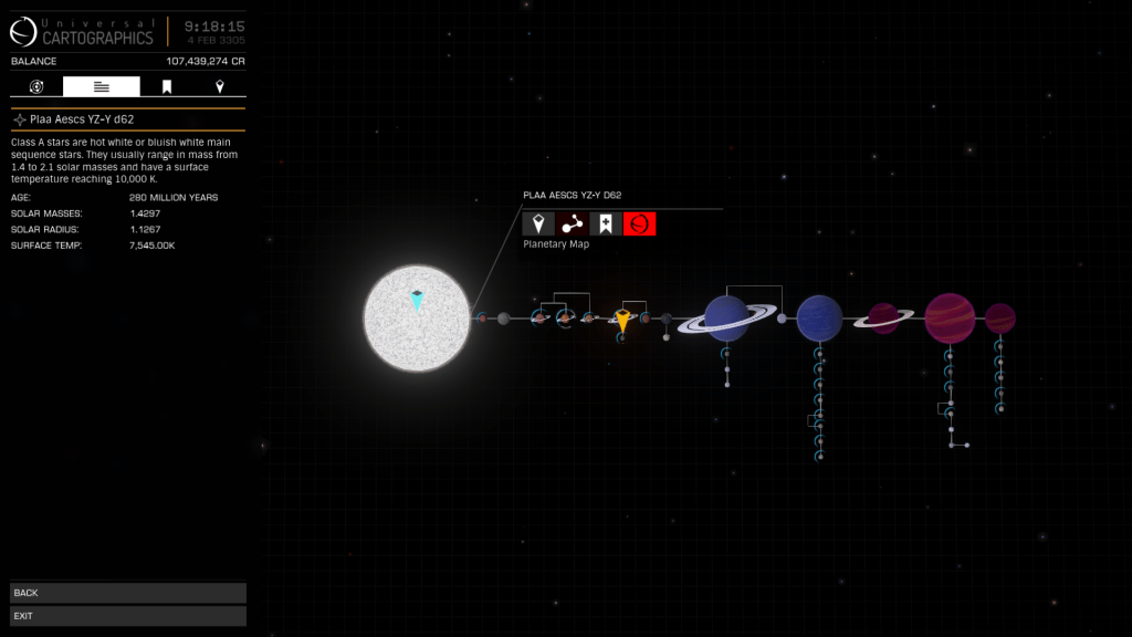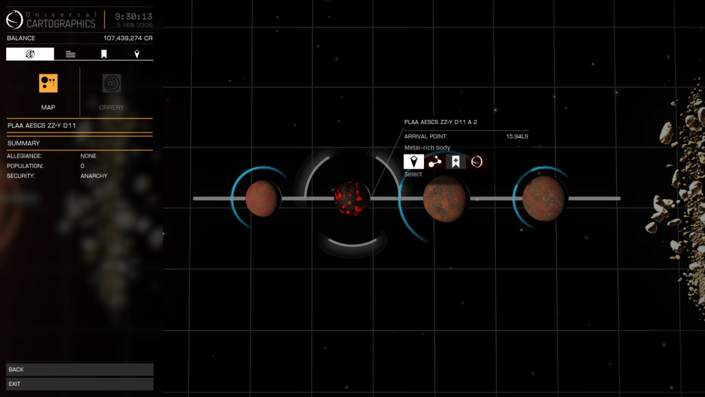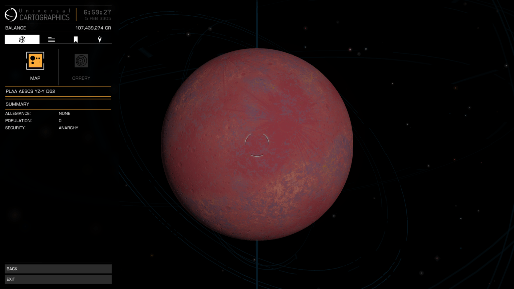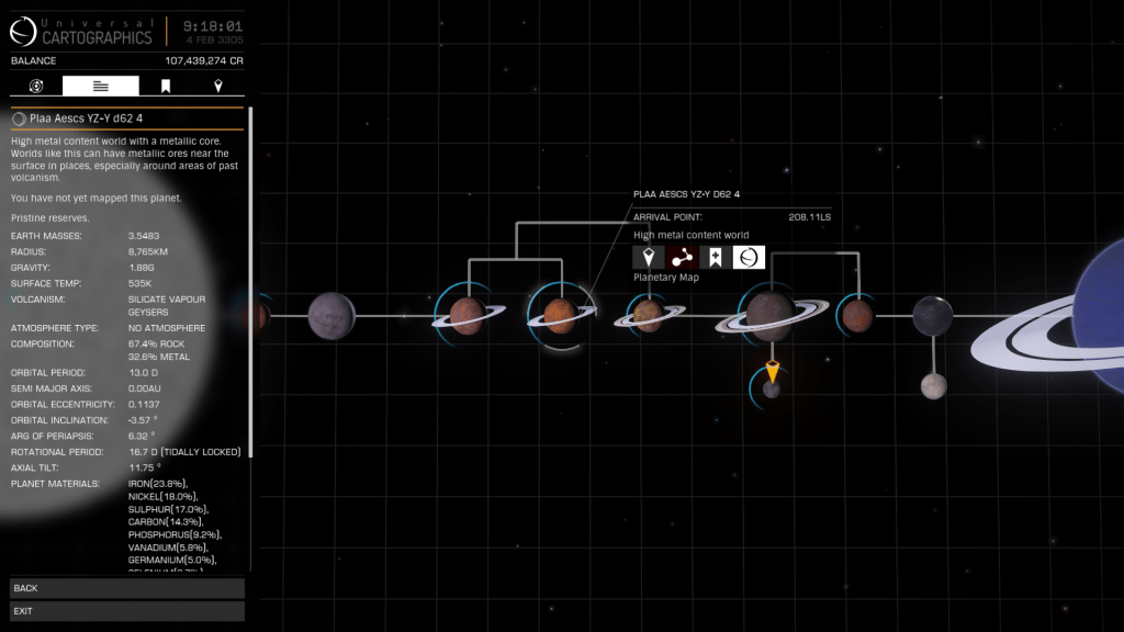 Time to explore Plaa Aescs YZ-Y d62 with its 41 Bodies 4 of which are Landable Ringed High Metal Content Worlds, one of which Plaa Aescs YZ-Y d62 6 is the largest HMC Planet I have encountered at 16,527 km radius. System scan shows some interesting looking mountain formations as well so plenty to check out.