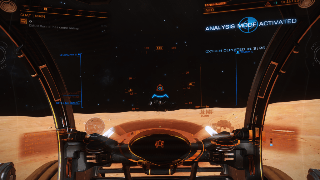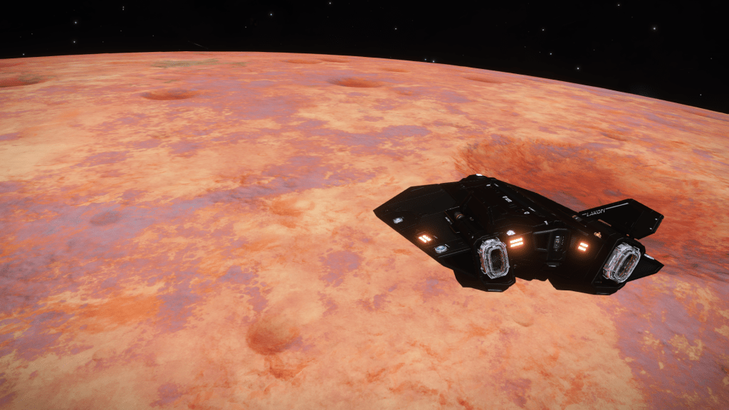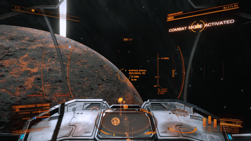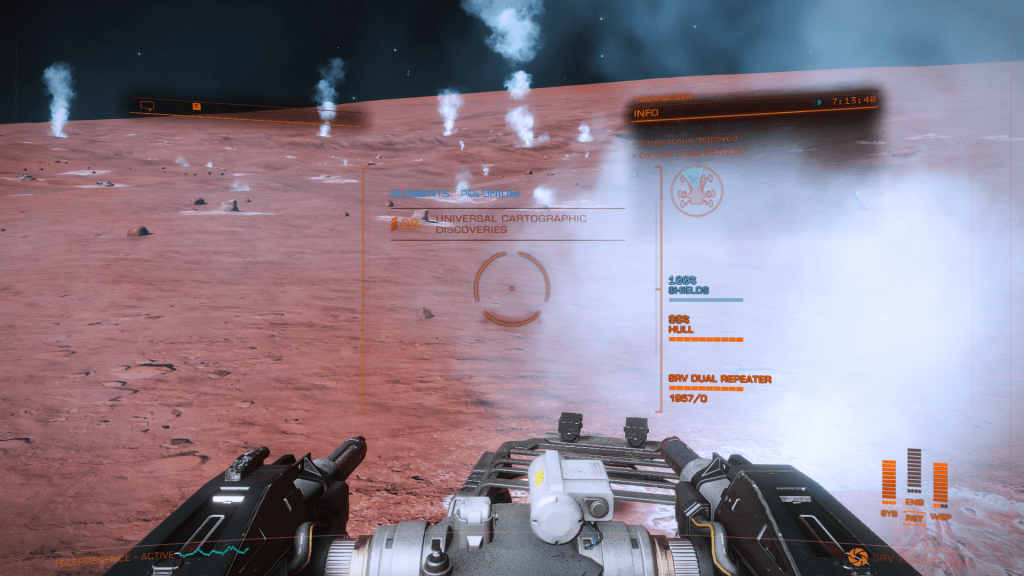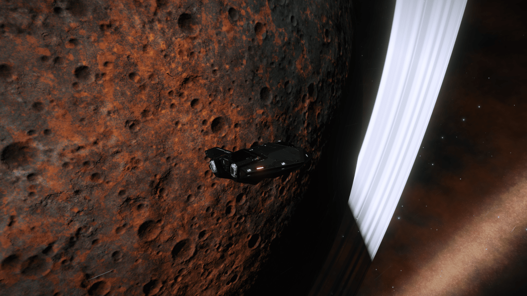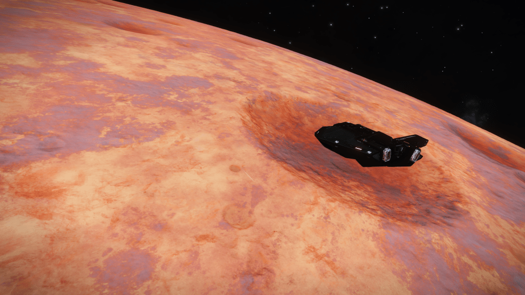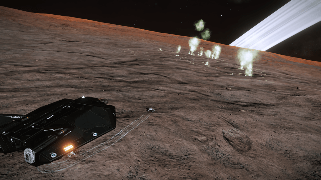 Everything is going great until about 200m above the surface when I take over from Verity and apply just a little too much upward pitch, Tannhauser lurches down hard and before I can recover slams into the planet tail first, taking out the shields and damaging just about every internal system not to mention reducing the hull to 23% strength… Ouch. But she settles to the ground the right way up, battered but still intact. I consider just calling up a Hull Seal but figure I may as well get out the SRV and check out the damage, maybe it’s not to bad and I can make Orbit and limp back to Eagles Landing for repairs. A quick circuit around the ship and there are some serious scapes and dents but no obvious damage to the thrusters. Think she will make Orbit ok so may as well explore the area for a bit. Get a few hundred meters from the ship and there is an ominous cracking sound and the SRV hull integrity alarm goes off… Seems the SRV has suffered damage and there are only 3 minutes of Oxygen left in the tanks… time to head back to Tannhauser pronto. I make it with a minute to spare, fire up the thrusters and Verity makes a flawless liftoff sending us quickly into orbit.