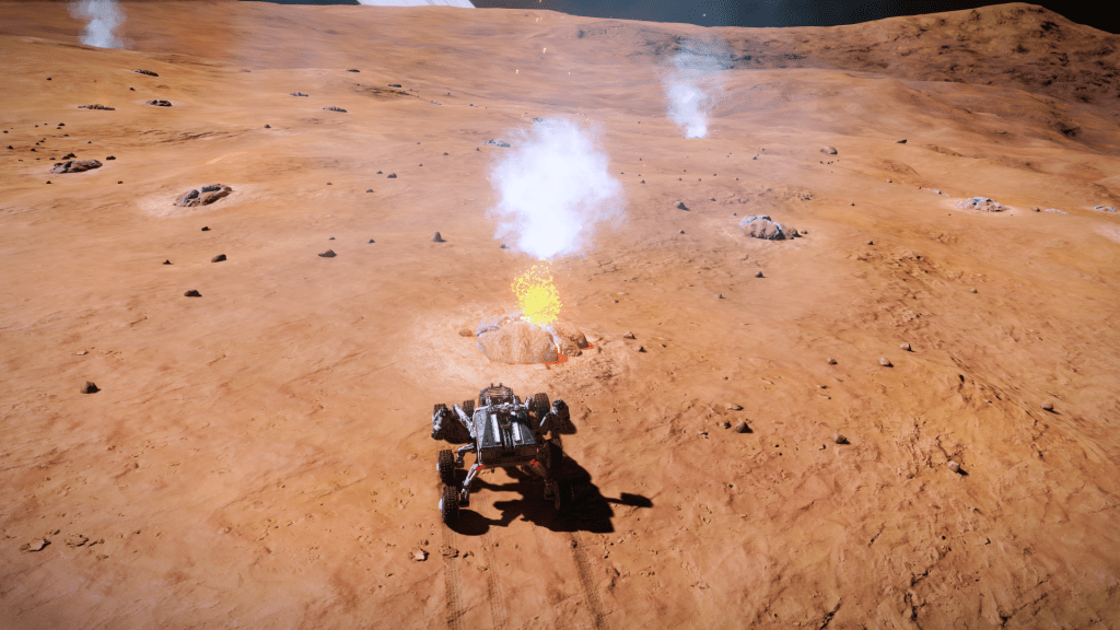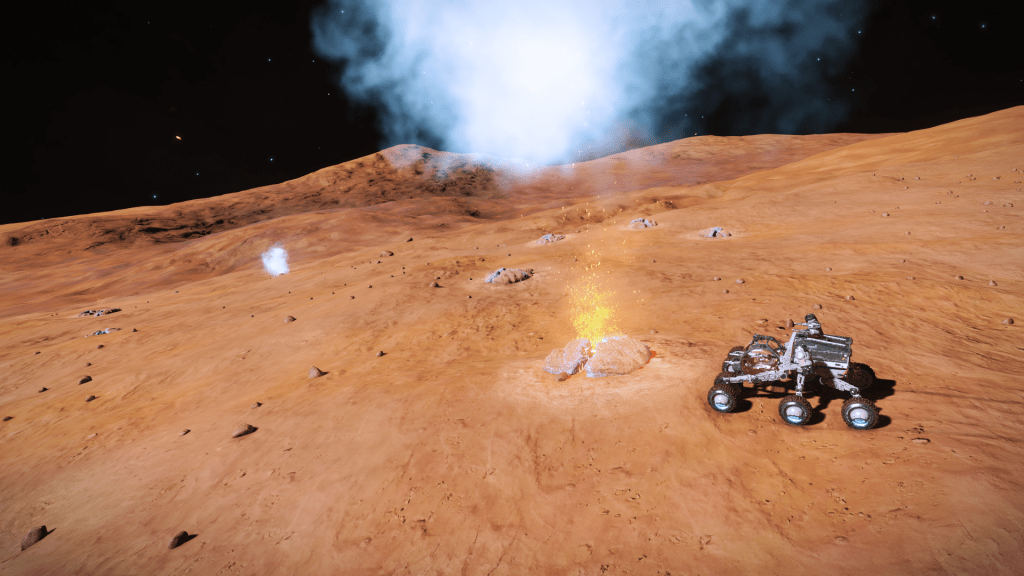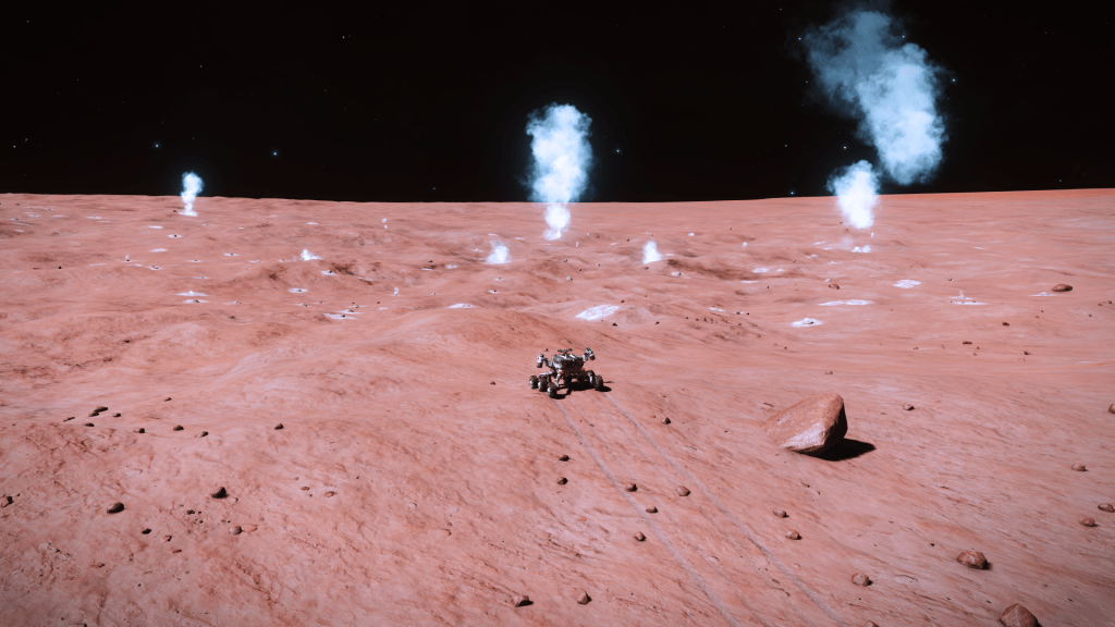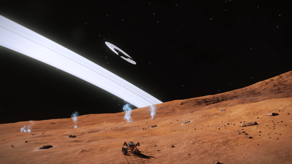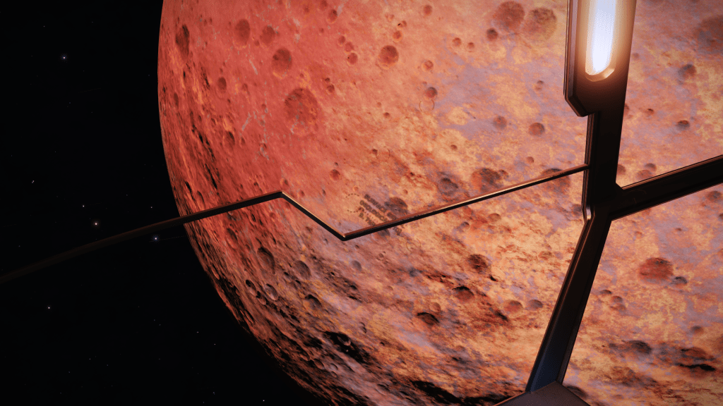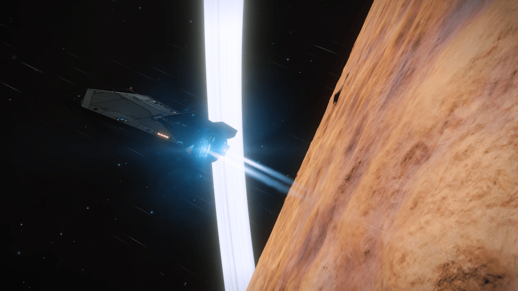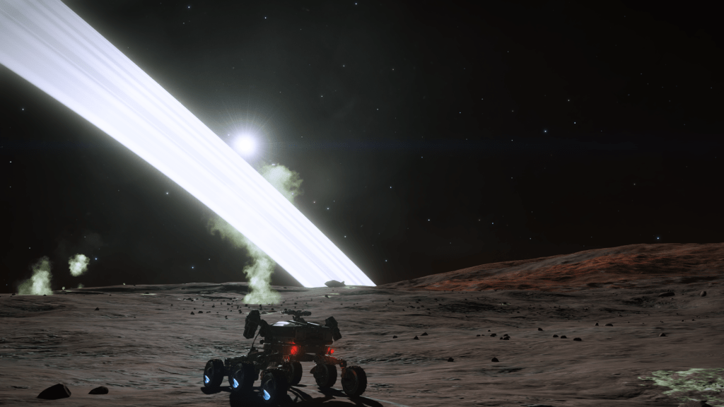 Everything is going great until about 200m above the surface when I take over from Verity and apply just a little too much upward pitch, Tannhauser lurches down hard and before I can recover slams into the planet tail first, taking out the shields and damaging just about every internal system not to mention reducing the hull to 23% strength… Ouch. But she settles to the ground the right way up, battered but still intact. I consider just calling up a Hull Seal but figure I may as well get out the SRV and check out the damage, maybe it’s not to bad and I can make Orbit and limp back to Eagles Landing for repairs. A quick circuit around the ship and there are some serious scapes and dents but no obvious damage to the thrusters. Think she will make Orbit ok so may as well explore the area for a bit. Get a few hundred meters from the ship and there is an ominous cracking sound and the SRV hull integrity alarm goes off… Seems the SRV has suffered damage and there are only 3 minutes of Oxygen left in the tanks… time to head back to Tannhauser pronto. I make it with a minute to spare, fire up the thrusters and Verity makes a flawless liftoff sending us quickly into orbit.