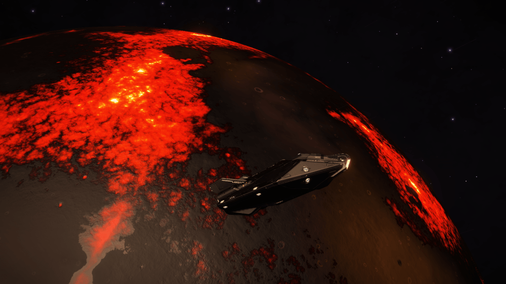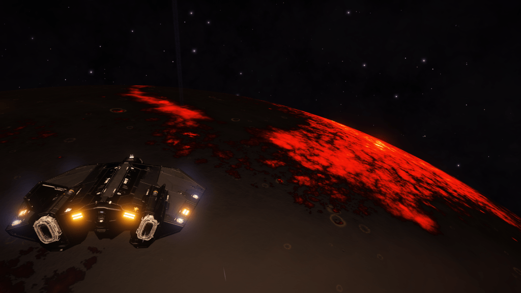 With the new Polonium to boost the FSD its only 4 jumps back to Eagle Landing. Tannhauser makes her first 100lY jump on the way back, and we come across a brilliant red planet with some serious volcanic activity going on.