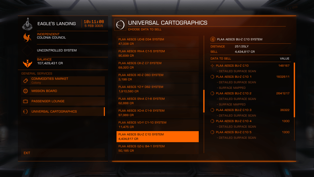 We arrived safely at Eagles Landing and cashed in accumulated Exploration data for a 13MCr and 29 more First to Discover, Best system payout was just over 4MCr so not bad.