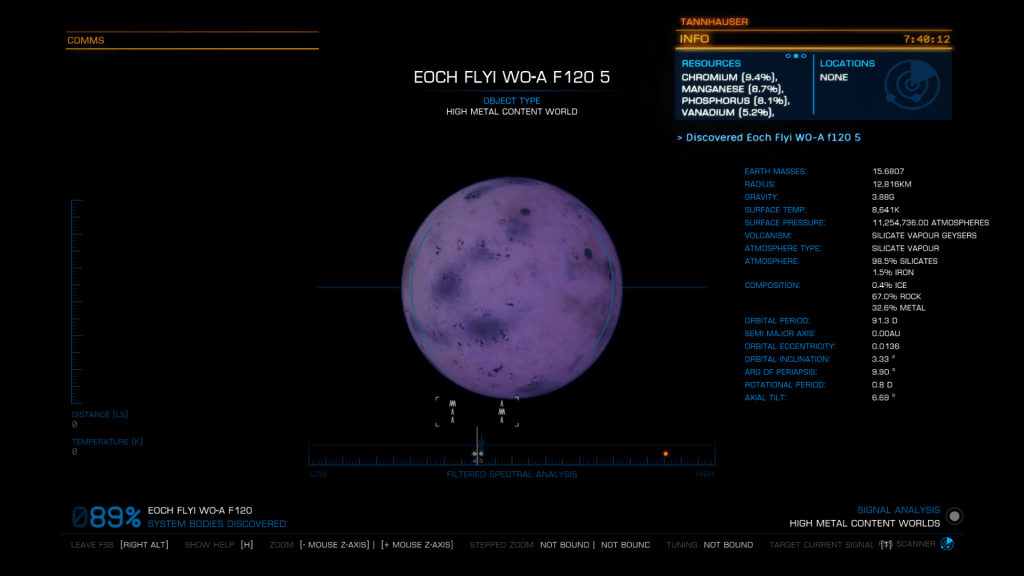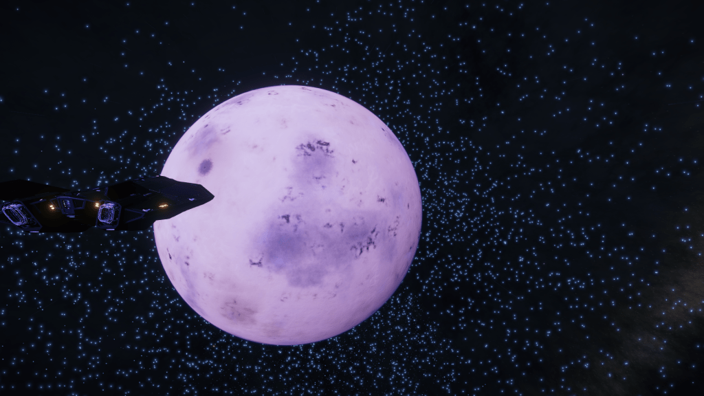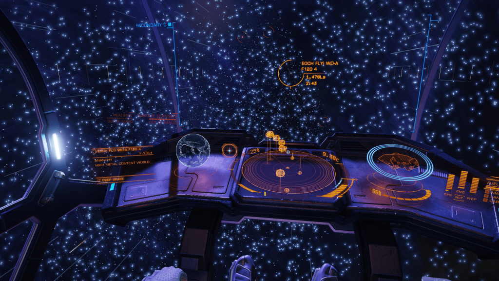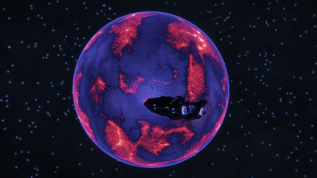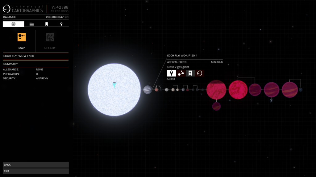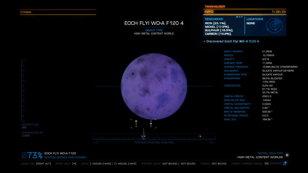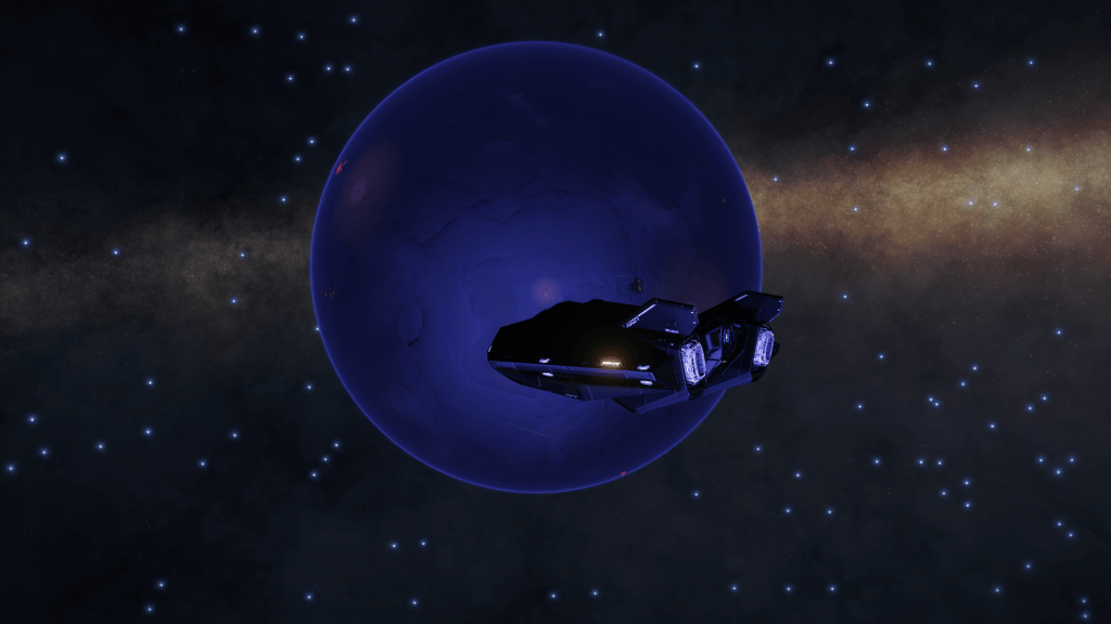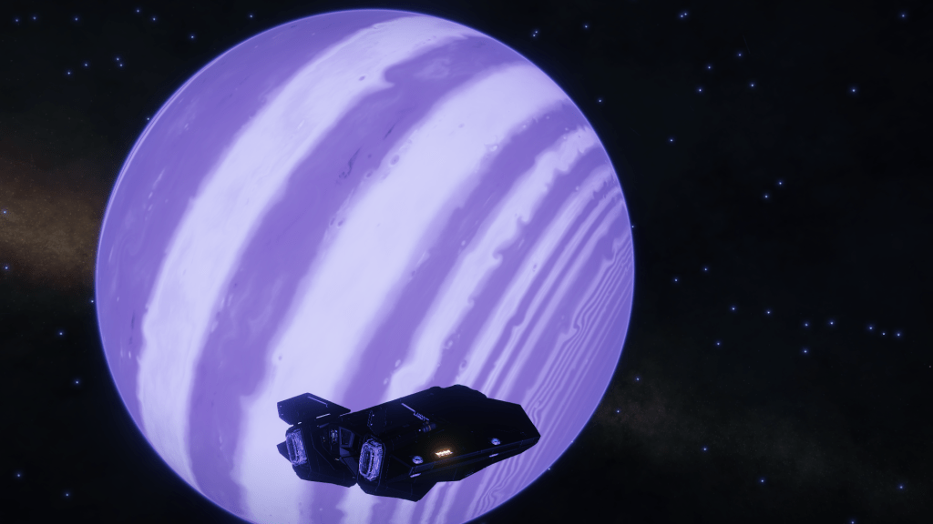 More exploring on the way to WP6, I have now entered the region of the Galaxy known as Odin’s Hold, and almost immediately I jump into a system of Giants… Eoch Flyi WO-A f120. Up until now the largest High Metal Content planet I have found was 12505 km radius, this system has no less than 4 planets larger than that at. 12816, 13290, 13645 and my new record largest HMC World Eoch Flyi WO-A f120 at 13706 km radius and 4.61G. Took the time to map them all for adding to the Codex and got some good drone pics too. At seven stars in the one system, it might be the most stars I have encountered in one place too.