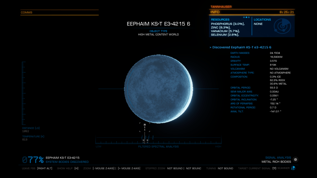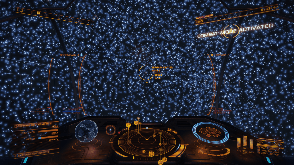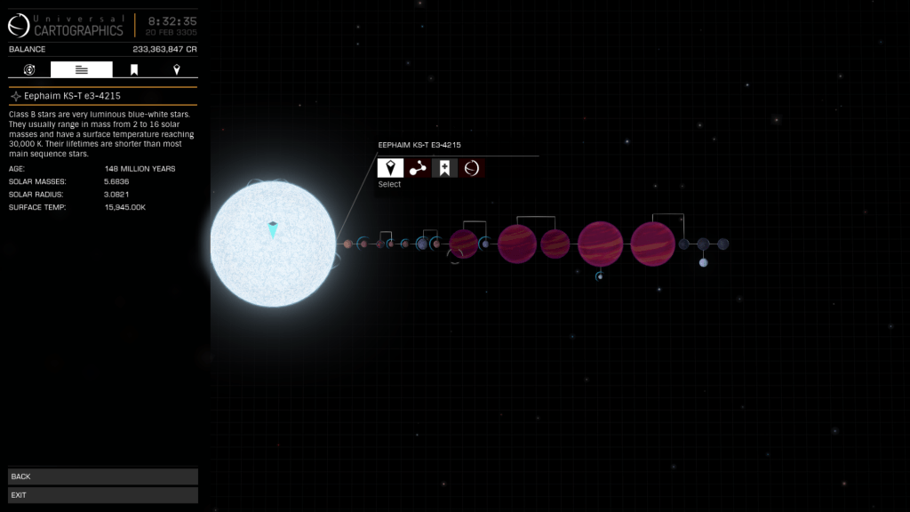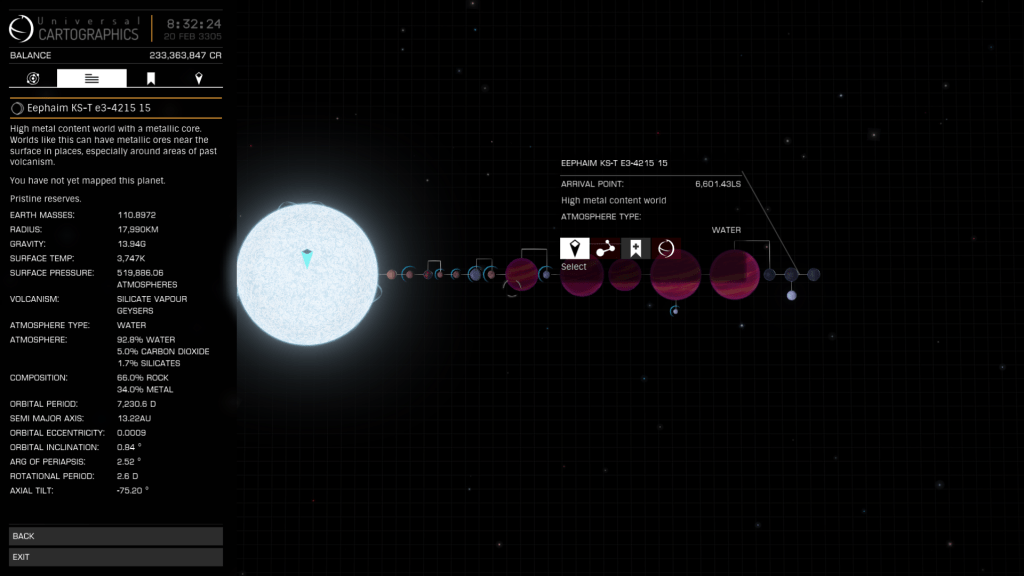 Well pleased with yesterdays efforts and the records broken I set off again for WP6 and bugger me a few jumps later I landed in Eephaim KS-T e3-4215 another system of giants, six stars and no less than five more large High Metal Content Worlds. 13717, 14027, 15867, 16590 and a new record 17990kms and 13.94 G’s Eephaim KS-T e3-4215 15.